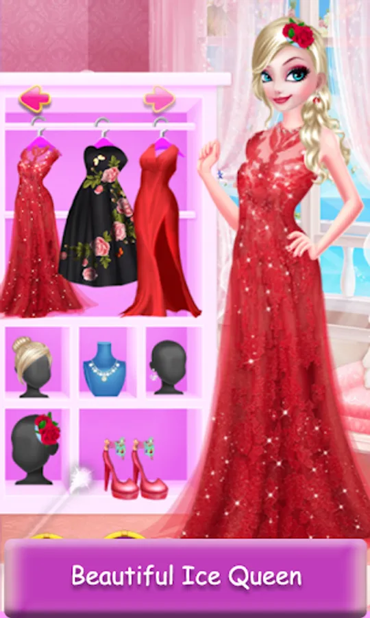 Do you love ice princess games, so play this princesses dress up makeup game and help ice queen and ice princess put beautiful red dresses and wedding dresses, and dress up them with dresses with flowers and beautiful hairstyles in this princess makeup and dress up salon game.