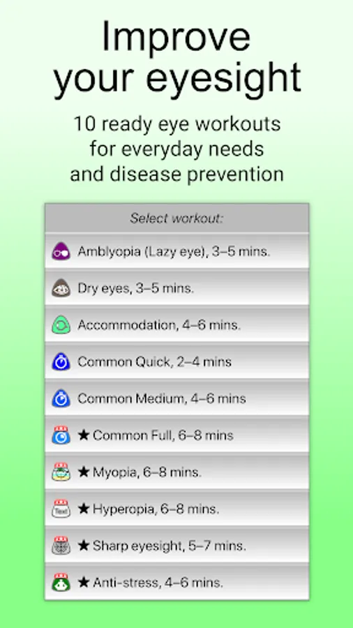 • My workouts mode to create your personal vision trainings with any exercises and settings according to the medical recommendations for eyesight treatment or your choice.