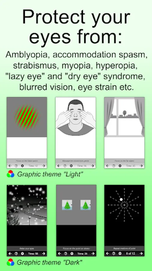 It is a mobile app for health and activity of the eyesight. Eyes + Vision help you with amblyopia, cyclospasm (accommodation spasm), myopia, hyperopia, "lazy eye" syndrome, strabismus, "dry eye" syndrome, ocular strain etc. Also it helps to improve: well-being, vitality, precision, concentration, performance and stress relief.