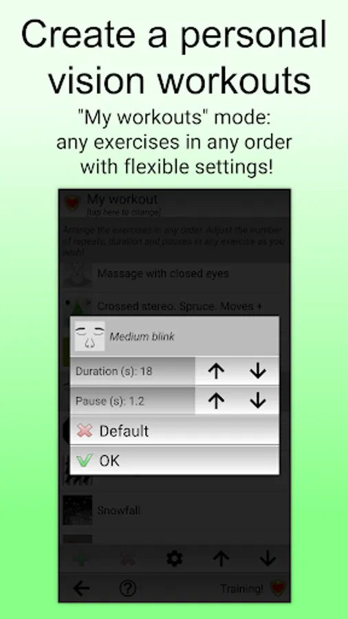 If your oculist has advised you on certain vision exercises, you can use the My workouts mode to create your personal vision training or selectively run the eye exercises you need from the List of exercises.