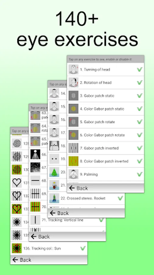 • Access to 140+ exercises for eyesight with the ability to disable any exercise that doesn't suit you. All ocular exercises are animated and there are additional hints: graphics, voice, text and video.