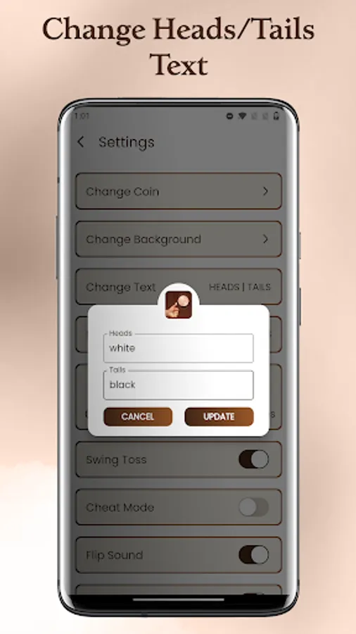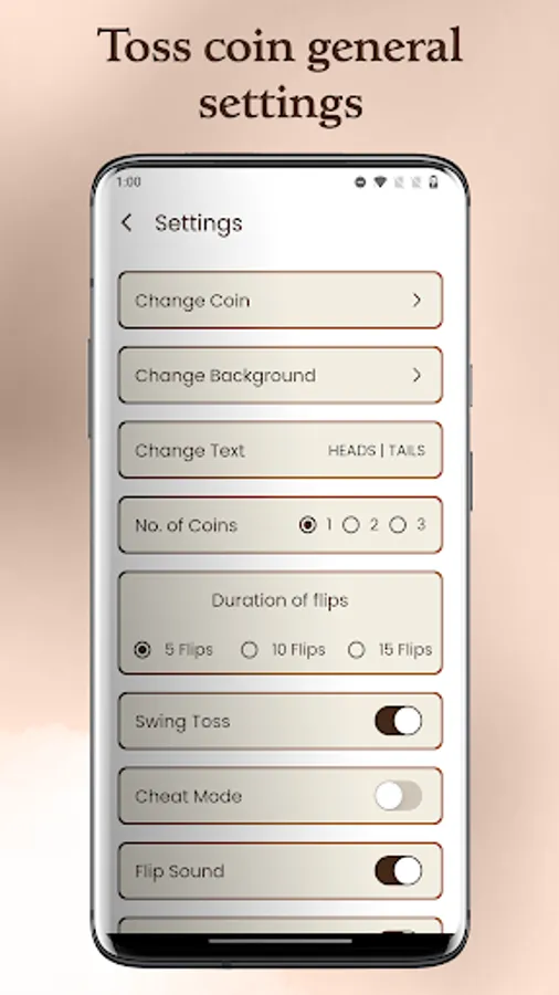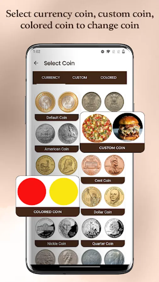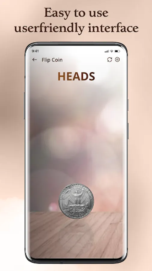 - Using the Settings menu, you can customize the animation, sound, text, vibration, shake-to-flip, and coin type of the spinning coin.