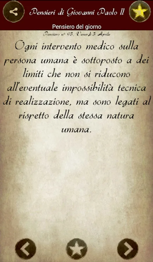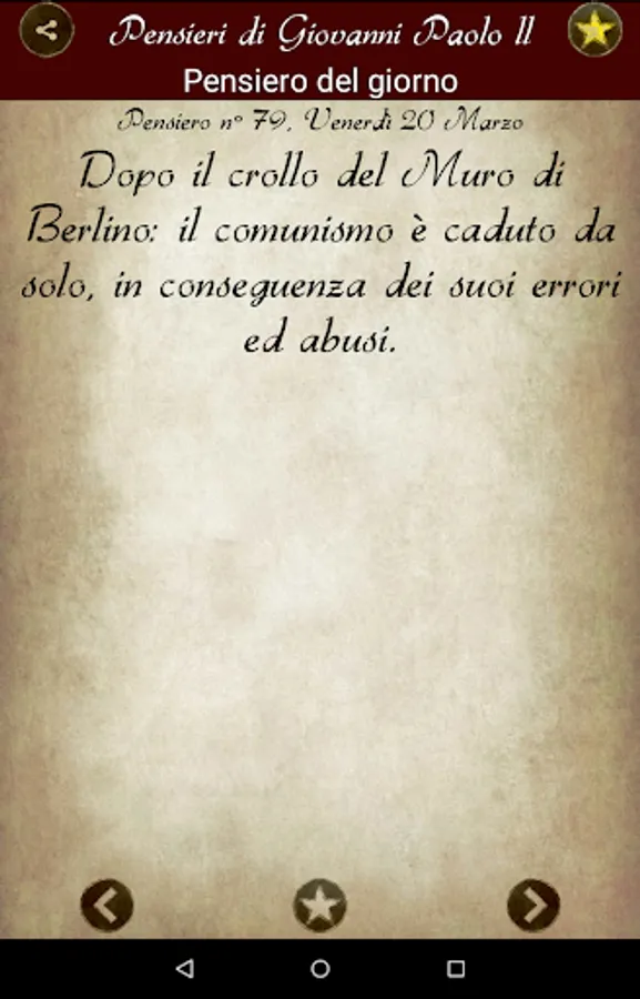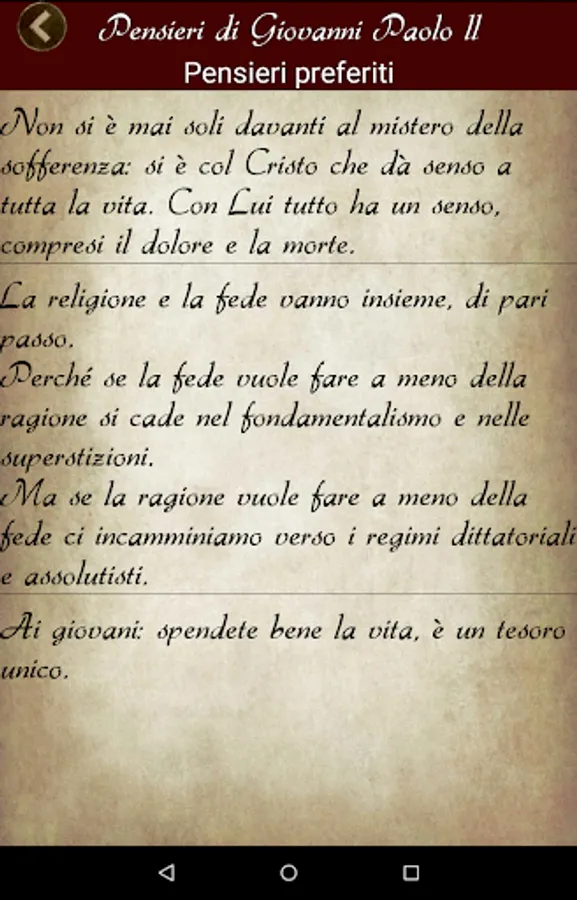 Read every day a thought and a wonderful phrase of Pope John Paul II. You can scroll through the 365/6 days of the year to dedicate the noble words. Also if you can not do without one or more of them you can put them in the lists of prefererite for a quick consultation.