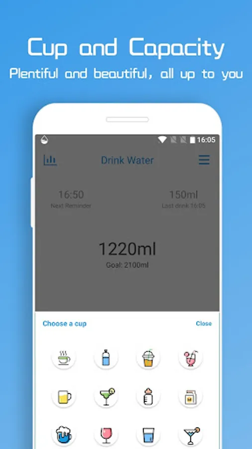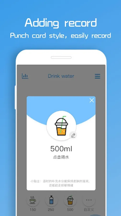 Easy to use, rich and beautiful. Drink water every day to remind you of the time to customize and challenge.