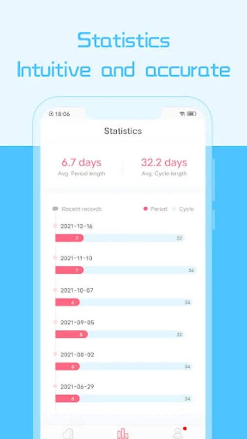 * Each menstrual cycle is clearly displayed in a list, and an average value is provided. Use statistics to help you better understand your menstrual period
