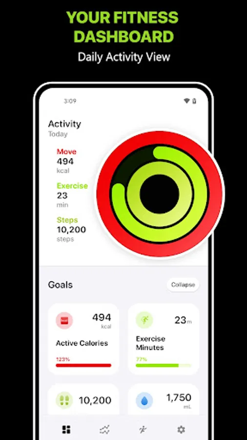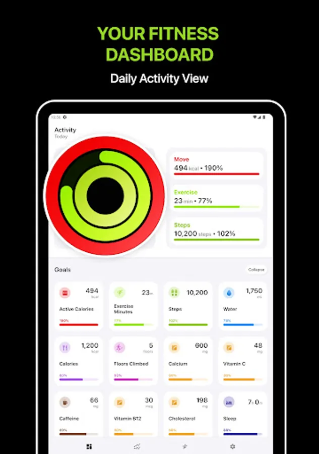 Today’s goals: You can track your daily health goals like Active Calories, Steps, Hydration, Calories Intake, and more.