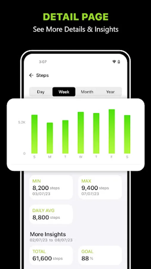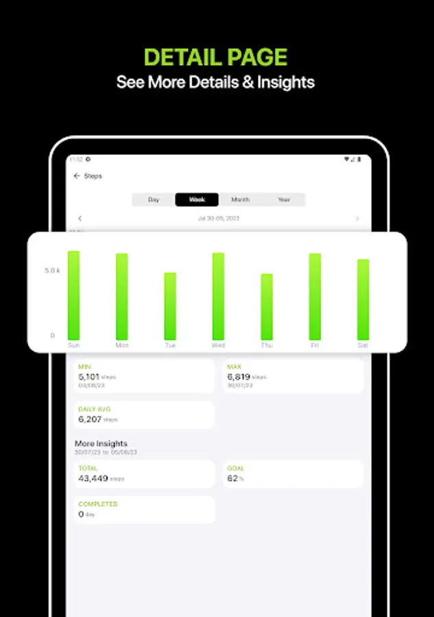 Activity: The activity ring consists of three parts: Active Calories, Exercise, and Steps. You can have a look at the data for the current day or any previous day in the week.