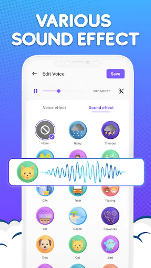 An attractive video certainly cannot be without sound effects. Free Voice Change provides a lot of sound effects such as rain sound, dog barking, clapping, photography sound, etc. to make your audio much more vivid. Let's try it with Voice-Changer!