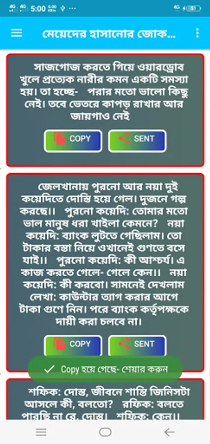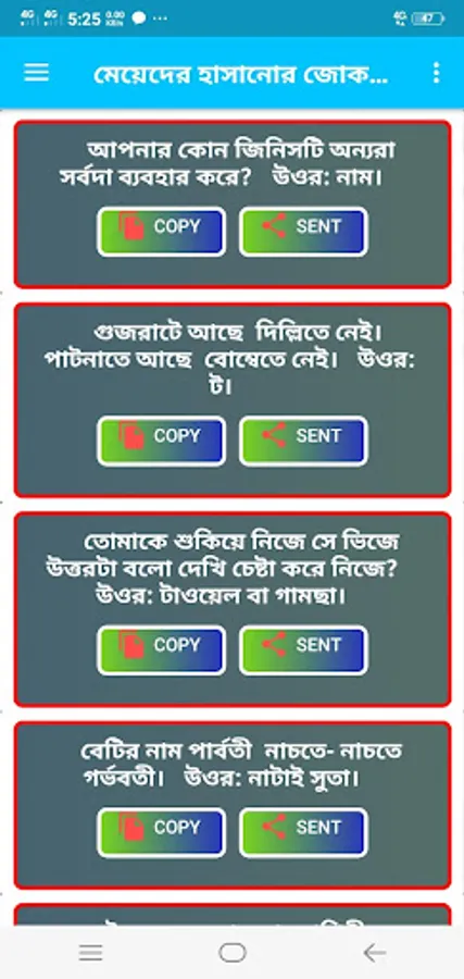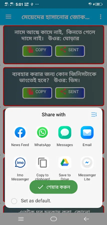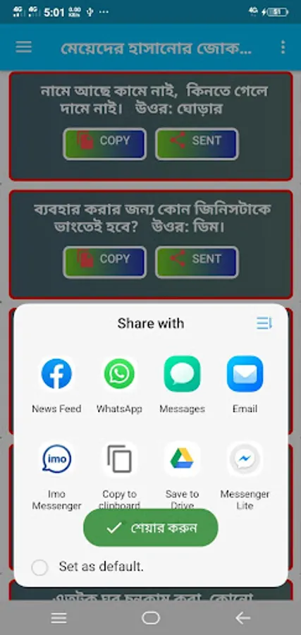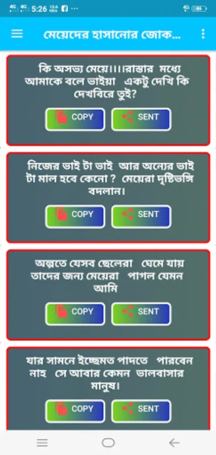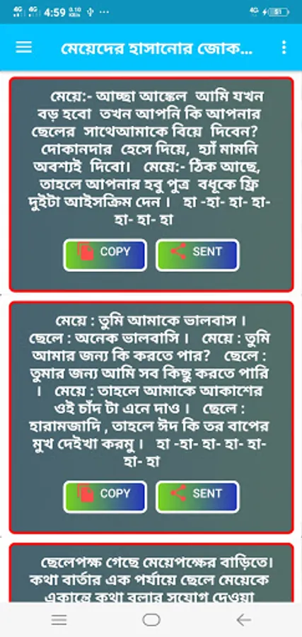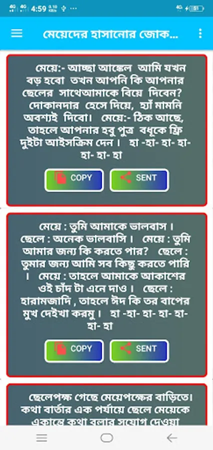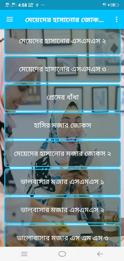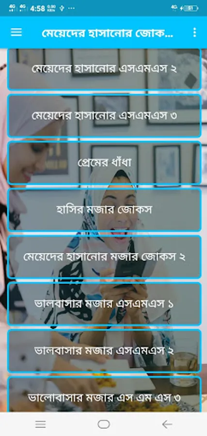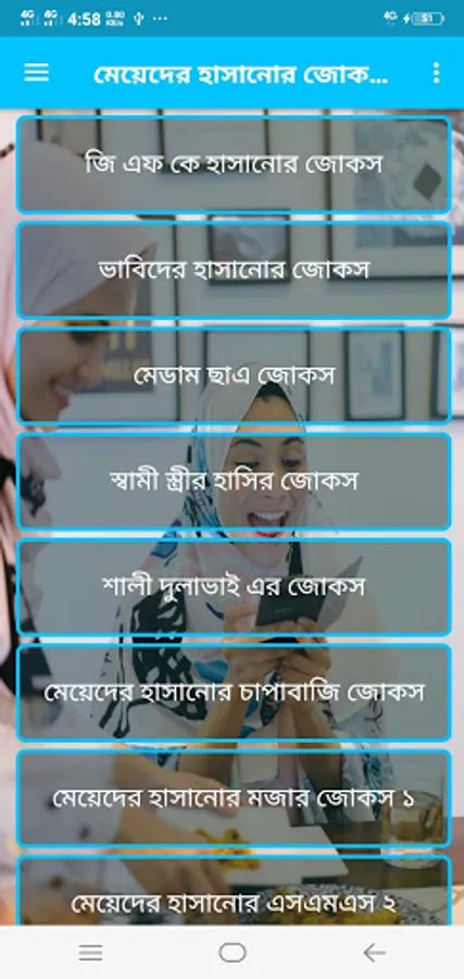 মেয়েদের হাসানোর জোকস এবং ধাঁধা।এই অ্যাপস এর ভিতরে রয়েছে মজার জোকস এবং ধাঁধা। আপনার প্রিয়জনকে আনন্দ দেবার জন্য এই অ্যাপসটি যথেষ্ট। মেয়েদের যেকোনো ধরনের মজার কথা আপনি শেয়ার করতে পারবেন। মেয়েদেরকে যে ছেলেরা হাসাতে পারে মেয়েরা তাদের বেশি পছন্দ করে। মজার জোকস বলুন এবং মেয়েদের আনন্দদিন করুণ। মেয়েদের বুদ্ধি পরীক্ষা করার জন্য ছোট ছোট ধাঁধা জিজ্ঞেস করতে পারেন এগুলো আপনি মেয়েদেরকে বললে মেয়েরা বেশি আনন্দ পাবো। নতুন মজার জোকস পেতে অ্যাপসটি ডাউনলোড করতে পারেন ধন্যবাদ।