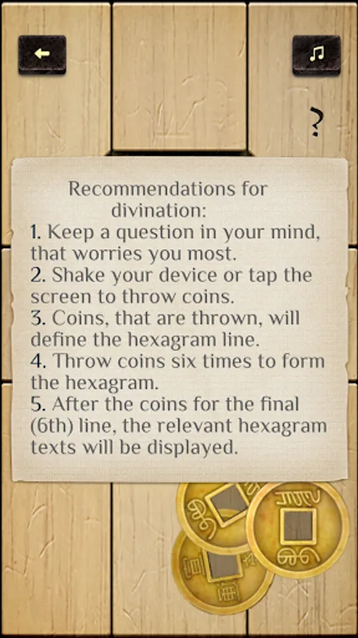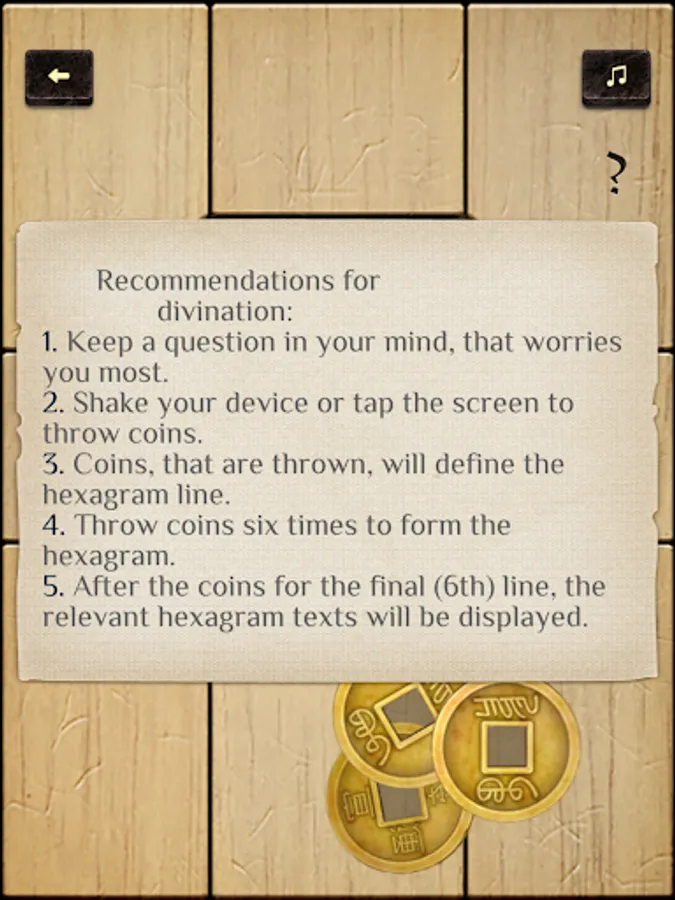 Canon of changes (originally the I Ching or Book of changes) written by the ancient Chinese philosophers and carefully recreated in this application will help you to find the answers! It’ll give you an advice how to reach the desired result and avoid misfortune.