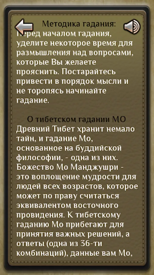 Ancient Tibet keeps a lot of secrets, and divination Mo, based on the Buddhist philosophy - one of them. Mo deity Manjushri - the embodiment of wisdom for people of all ages, which can rightly be considered the equivalent of the eastern providence. By Mo Tibetan divination resorted to making important decisions, and answers (one of 36 combinations), the data you Mo, are considered as originating from Manjushri. Tibetan divination system "Moe" has existed for centuries and gives a glimpse into the future, predict the turns of events and relationships. This is a clear and simple method to clarify the most important spheres of life and to receive advice on how to solve the most favorable specific case.
