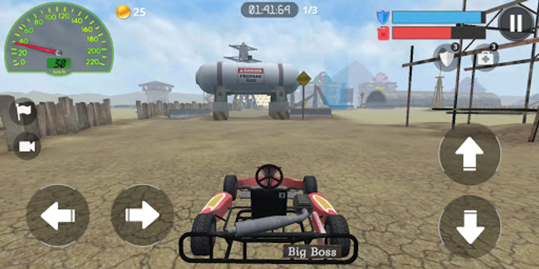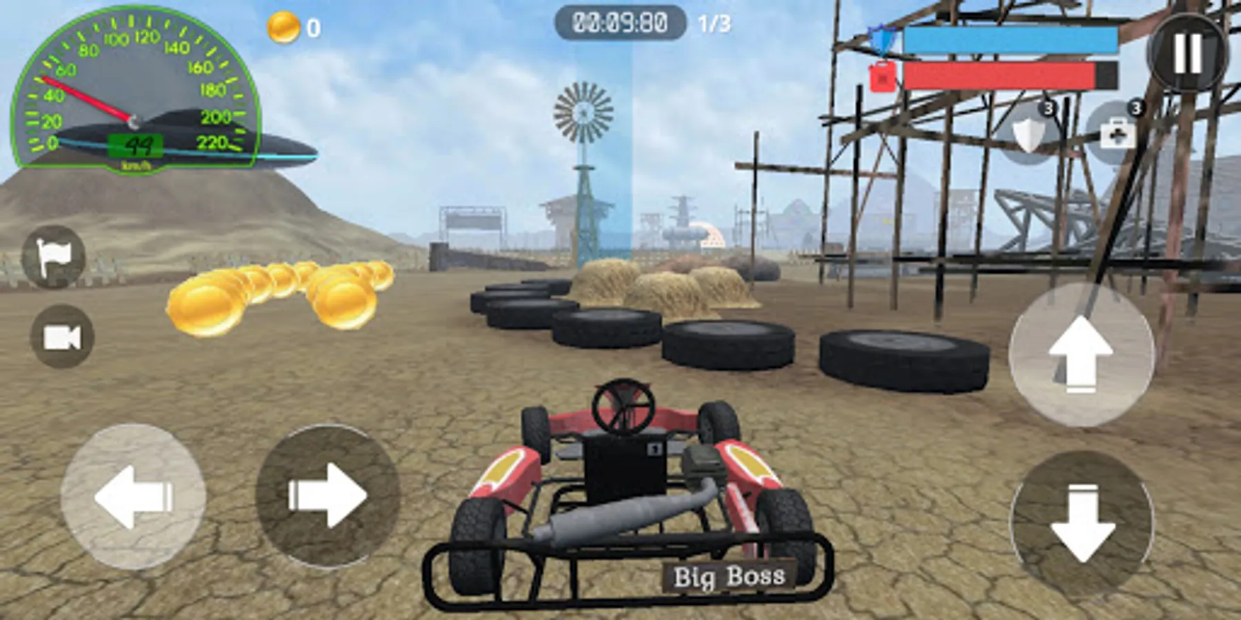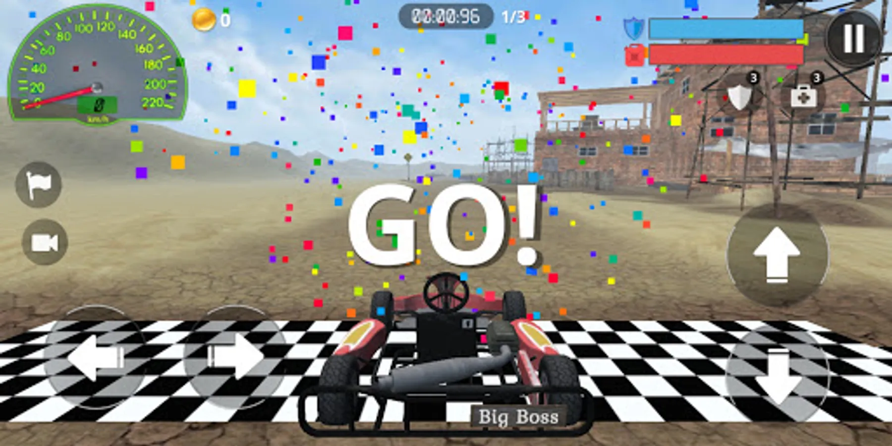 Try to overcome the winding track from the 1st or 3rd person. This go-kart will improve your driving skills with each new race. Feel the drift! Many sharp turns and sandy terrain – a real treat for fans of controlled skidding. In addition to the day mode, you can buy evening mode with sunset for the open world. Also in the store you will find invulnerability shields and first aid kits. Racing Kart 3D gives a unique opportunity to race with your own license plate, on which you can write anything and paint in any color. Single karting with smooth controls will appeal to players of any age.