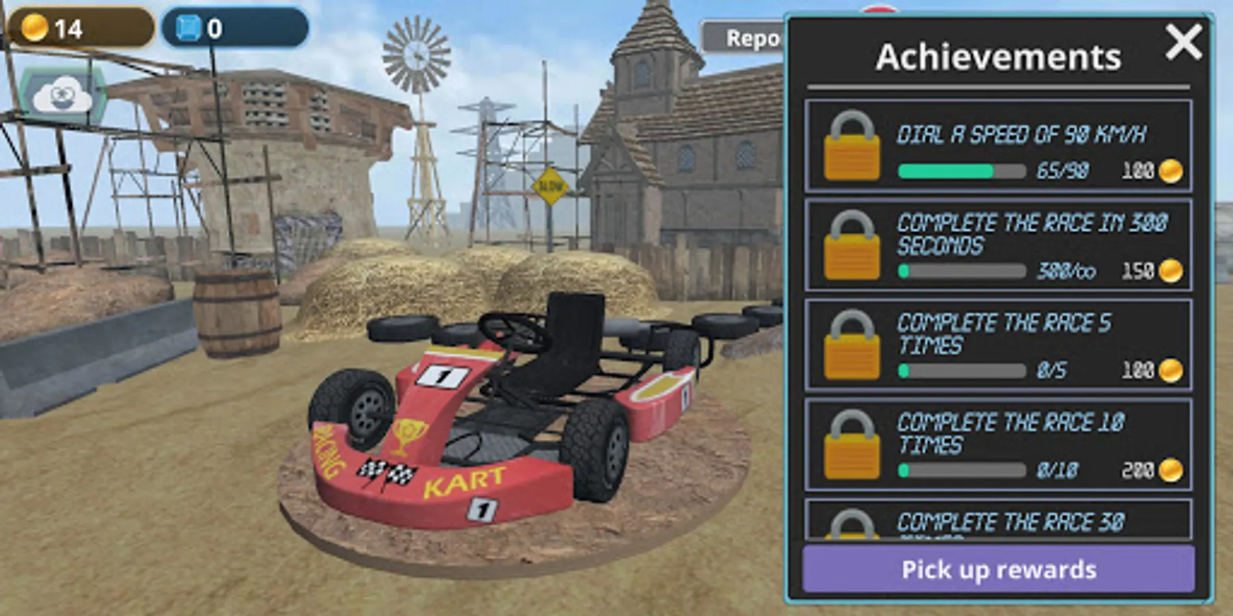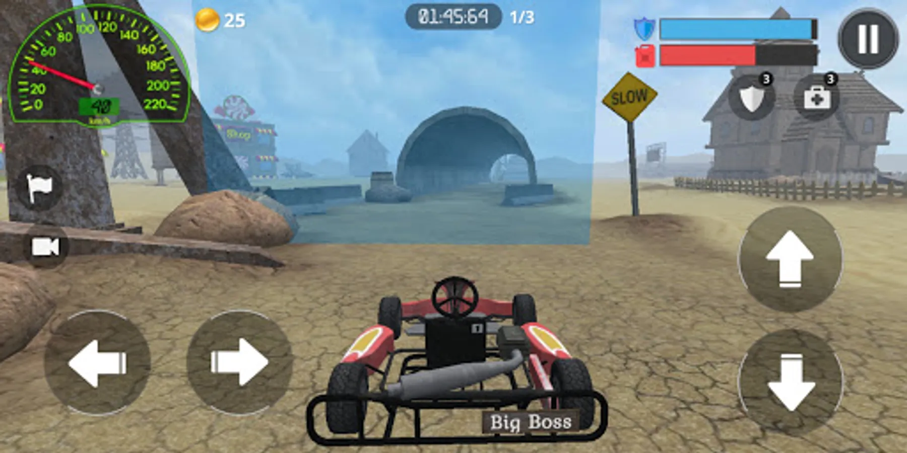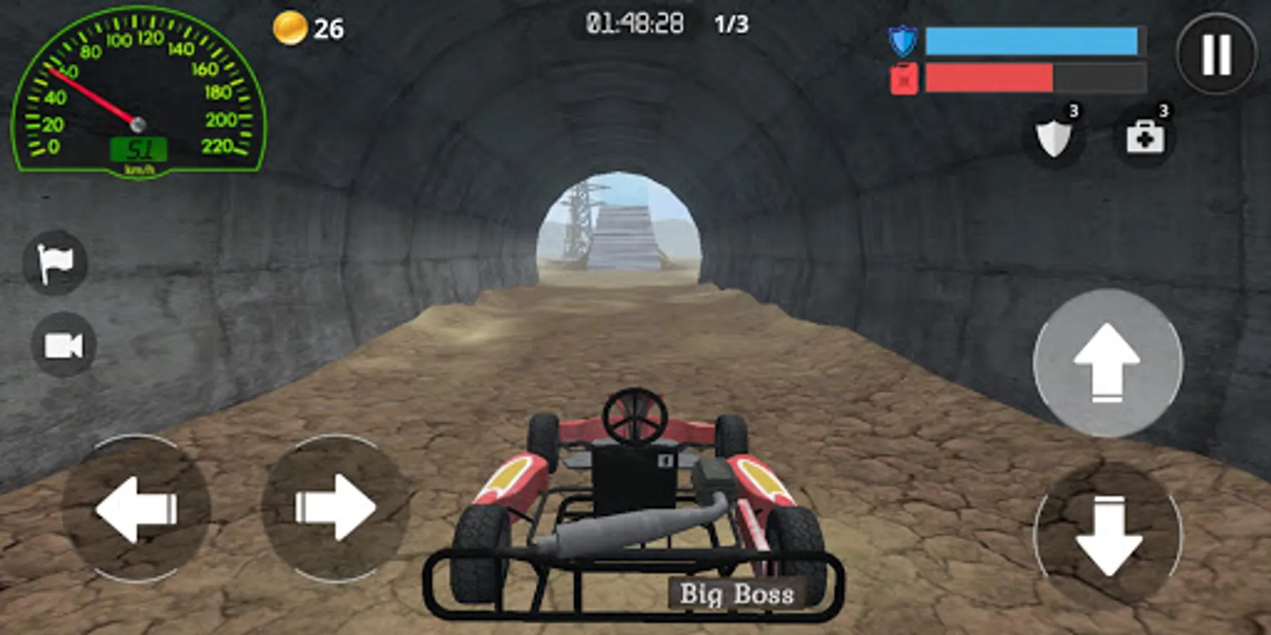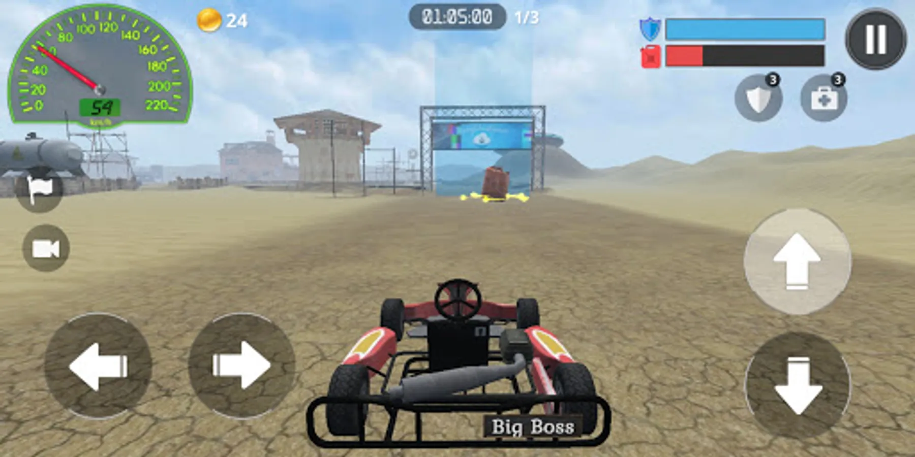 Try to overcome the winding track from the 1st or 3rd person. This go-kart will improve your driving skills with each new race. Feel the drift! Many sharp turns and sandy terrain – a real treat for fans of controlled skidding. In addition to the day mode, you can buy evening mode with sunset for the open world. Also in the store you will find invulnerability shields and first aid kits. Racing Kart 3D gives a unique opportunity to race with your own license plate, on which you can write anything and paint in any color. Single karting with smooth controls will appeal to players of any age.