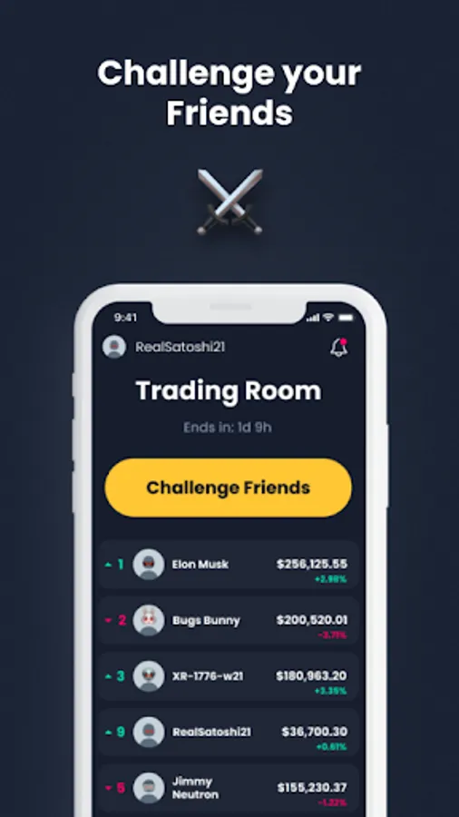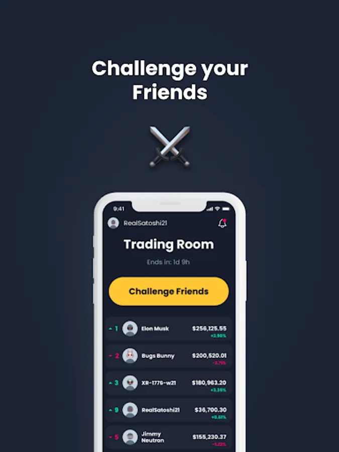 - Challenge your friends with invitation links and discover who is the best crypto trader.