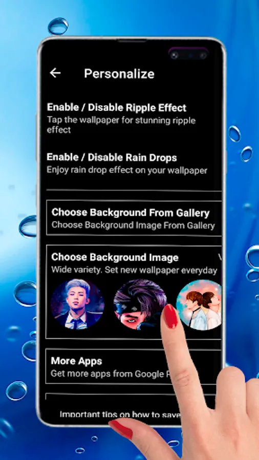 These cute 4K live wallpapers with water ripple effect here include pretty images of BTS boys! There are lots of kpop bands like Black Pink, Red Velvet, Bts, Suzy and others!