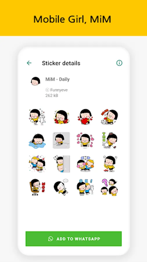 This WAStickerApps will be updated frequently. Each time you will be able to meet the new characters of Funnyeve. Currently, you can see all of the 8 characters from Funnyeve, including 'Mobile Girl, MiM'.