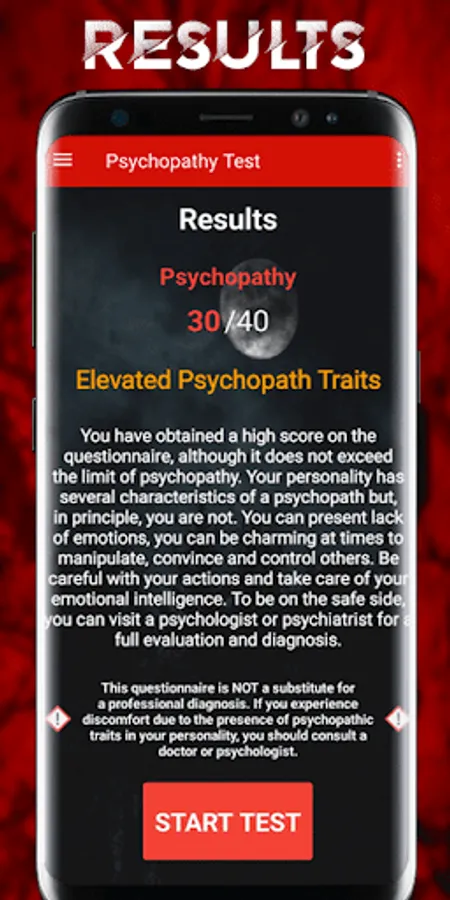 You will obtain your personalized result and the complete interpretation to know the degree of presence of psychopathy in your personality.