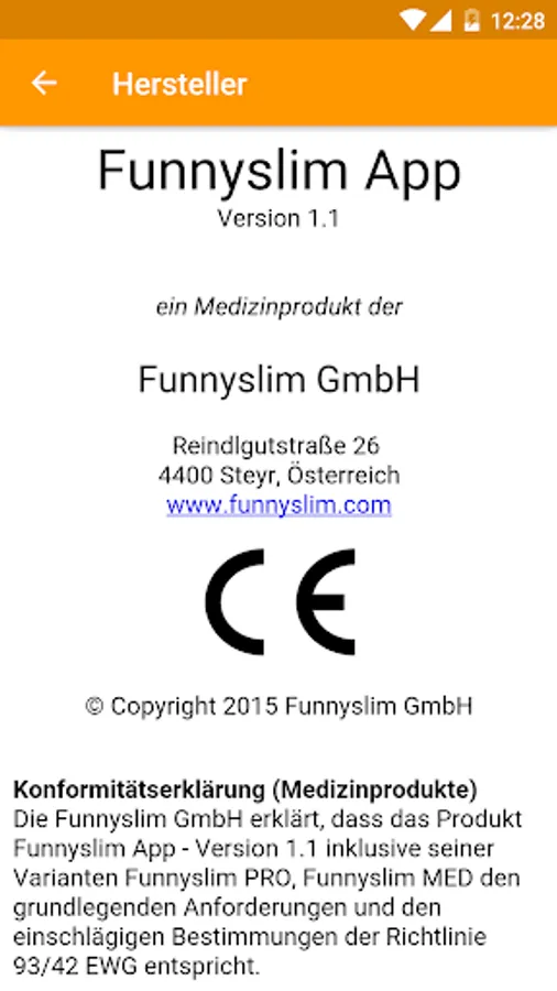The Funnyslim GmbH declares that the product Funnyslim App - Version 1.1, including its variants Funnyslim PRO, Funnyslim MED meets the essential requirements and the relevant provisions of Directive 93/42 EEC.