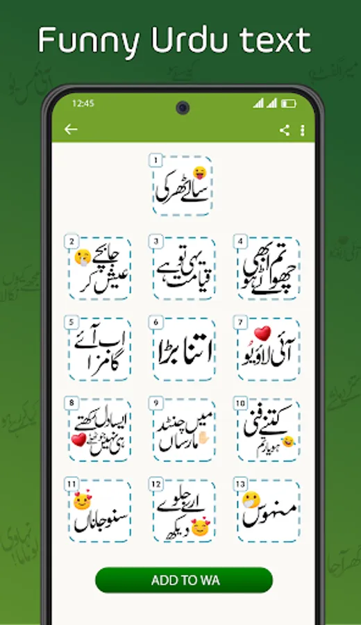 Are you willing to make your WA chat more fun? Are you willing to try daily words in text? Are you willing not to write daily use sentence and want WASticker of it? Are you desire to have multiple language text stickers which will make your chat easy? 😲 Yes... Oh Yes. Then you are at right place. 💥 We have provided all your desires of Urdu stickers in this app.💥