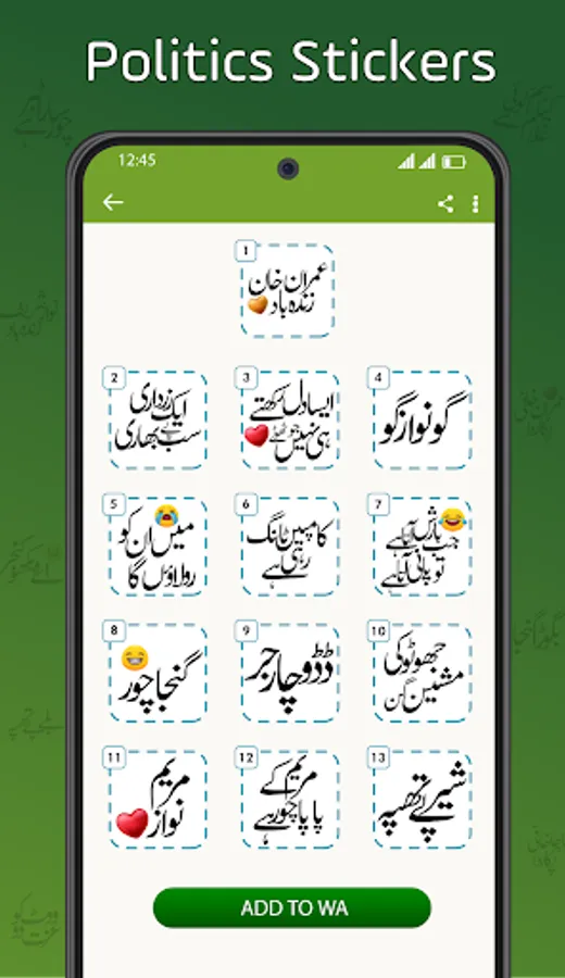 So why are you waiting for!. Download this amazing Urdu text stickers app and enjoy the collection of our beautiful stickers.😊 In this app we have added punjabi stickers, morning stickers, good night stickers, calling stickers, daily use text stickers, pushto stickers, islamic stickers and urdu sentence stickers. You can make your WA chat more fun with this app. If you want memes stickers we have also provided a set of memes stickers in it. Our moto is 💖 you desire we will fulfil 💖. So no worry if you can't find stickers of your choice you can mail your collection of text and we will definitely add all your desired stickers in next update. This Urdu stickers for WA contains pushto text category for 👳Pathan people. No need to install pushto keyboard we have added every collection of pushto words. We have not added any abusive language but for making fun this Urdu stickers app include funny daily use words. Urdu WASticker have multiple language funny stickers categories. You can share funny stickers, islamic stickers, pakistani stickers, indian stickers, pakistani politics stickers, indian politics stickers, 💘imran khan stickers, nawaz sharif stickers, maolana stickers and pakistani best political words stickers like 😀 barish ata hai to pani ata hai jb ziada barish ata hai to ziada paani ata hai 😀. This WASticker islamic contains more stickers of islamic packs. You can use islamic stickers and make your chat easy in islamic way. So make your WA messages and status looks colorful and funny using this.
