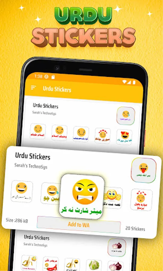 Make your WA messages and status look colorful and funny using this urdu stickers for Whatsapp. This Funny Urdu Stickers and Funny Emoji Sticker app for WA will allow you to have access to a great collection of stickers in so many categories. You will find a significant number of fun stickers. From this Funny Urdu WASticker - Urdu memes stickers you can share urdu funny stickers, Islamic stickers, emoji text stickers and flower text stickers english stickers on one click. Stickers are best way to send some funny, love or emotional messages. Stickers can change the mood of your loved one and friends. New funny stickers app help you express your emotions in a fun and creative way. Here you will find stickers for WhatsApp with text, cute animals, hearts. We created emoji with text, emoji in love. Here you will find daily stickers with good morning, good night. New stickers are permanently added to this sticker app. WASticker Stickers and emoji is your personal love stickers chat for in your daily conversations powering you with large and carefully choosen emoji stickers and romantic stickers collections for WASticker including Love and relationship stickers and couples love stickers. This app contains urdu text on flowers , urdu text on emojies and urdu text on vagitables. You can share all your expressions in different ways. You can share daily use words in english and urdu stickers also we have large collection of eid stickers. We have a spacial collection of eid stickers and you can share it in your way. You can share eid greatings and eid ul azha stickers from this stickers for WA app.