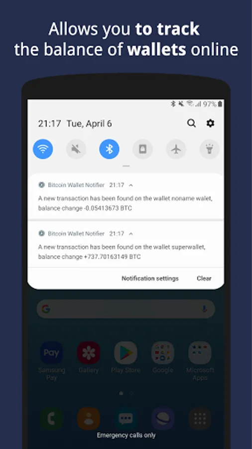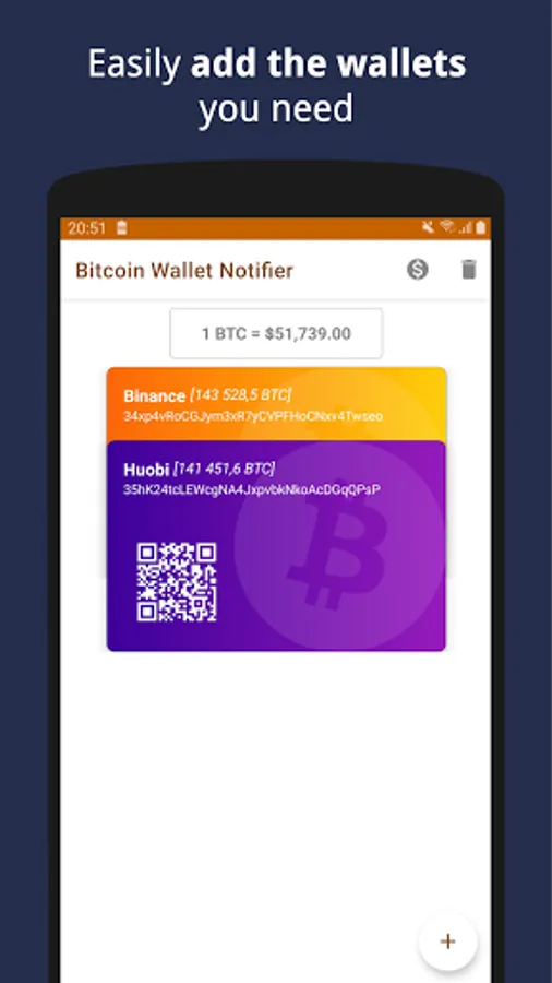 Important! We are not a cryptocurrency storage wallet, the application is designed to help get timely information about changes in the balance on your wallet or the wallets of other Bitcoin owners.