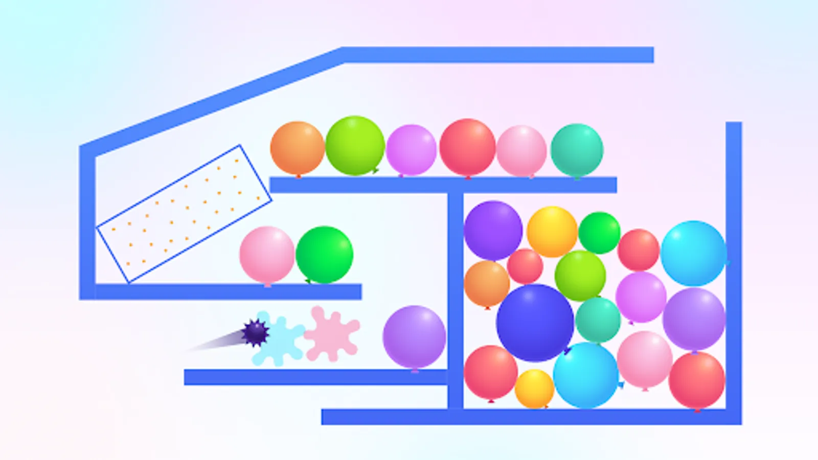 Thorn And Balloons is a very interesting casual bounce ball game. In the game, you need to control the strength and angle to launch the thorn ball, the thorn ball will bounce when it hits the wall, and all the balloons will be broken by rebounding to win.
