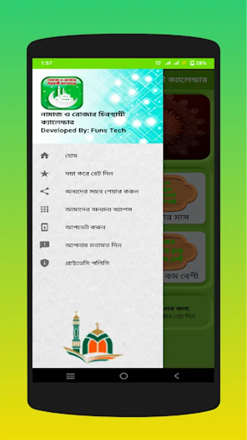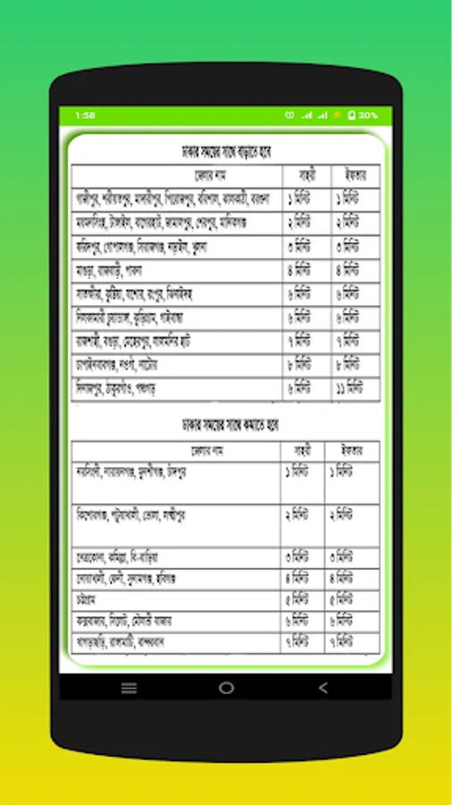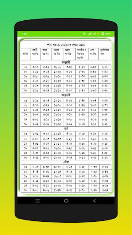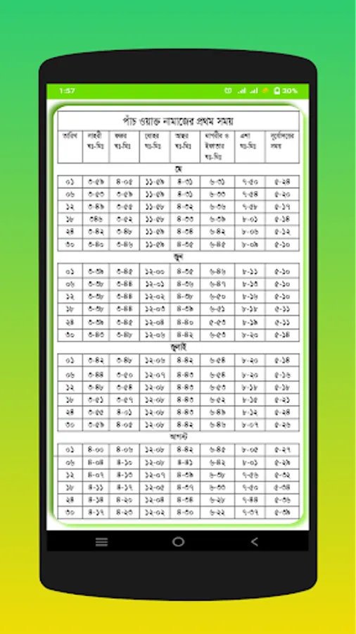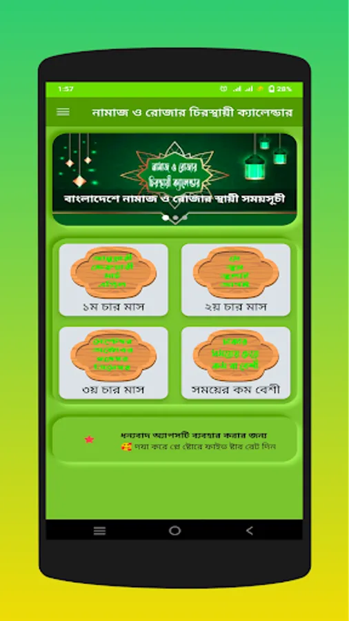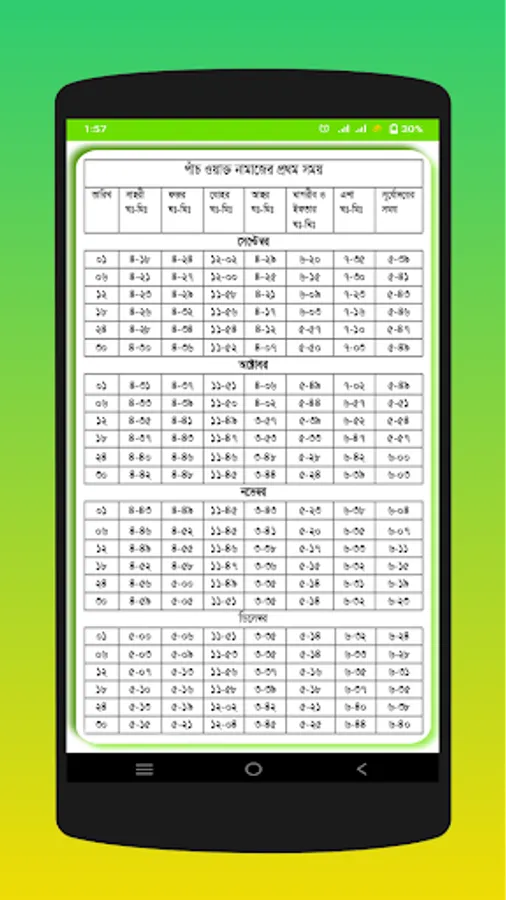 A: The first time of Namaz and Sehri has been mentioned in the app. This schedule applies to Dhaka and its environs. For other districts, you have to add time somewhere or subtract somewhere, which is listed in the app.