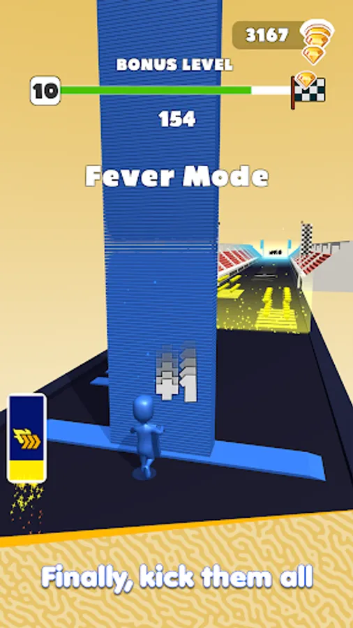 At the end of the level, you have to tap as fast as you can to boost your speed and kick the stack to get BOUNES.