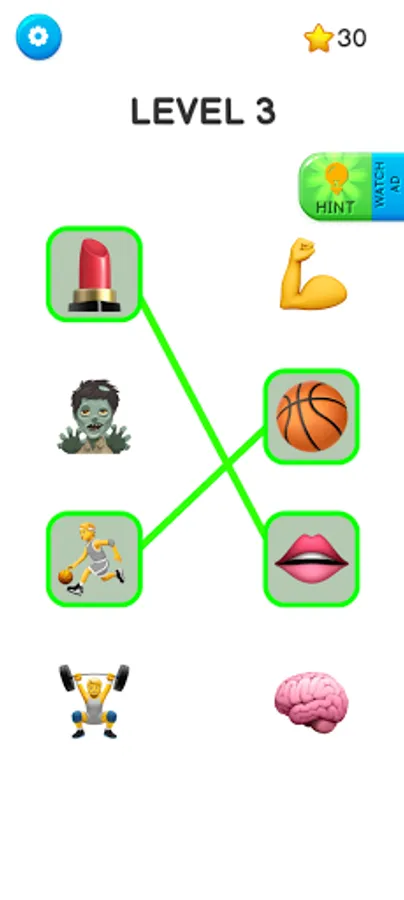 Every level shows you a number of emoji to connect, become the emoji master and solve the matching puzzle. Tap one by one on the elements from different columns to connect them with a line. Or drag to draw a line and connect elements from different columns.