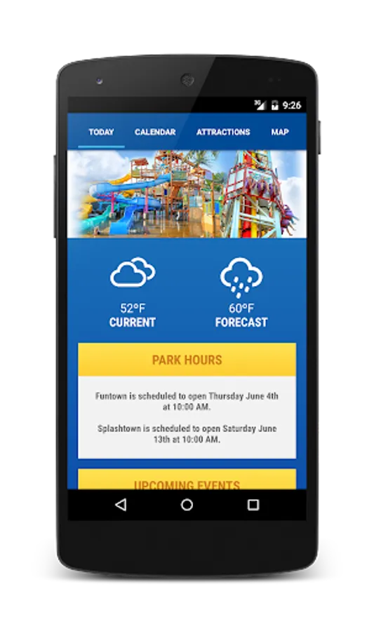 • The first screen has all the information you'll need for the day! From the park's status, to weather, to events, we've got you covered!