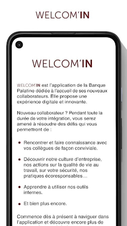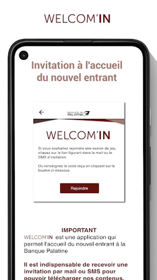 IMPORTANT: Welcom'IN is an application that enables the reception of the new entrant to Banque Palatine.