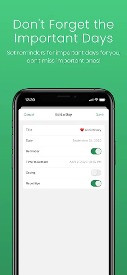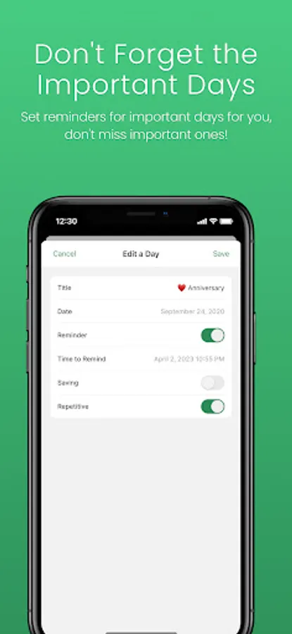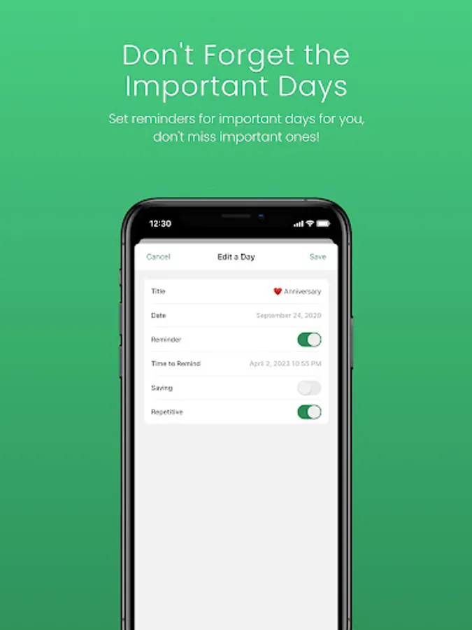 - The app will reminds you to special days by sending notifications at a time you specify.