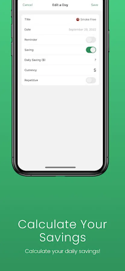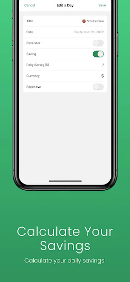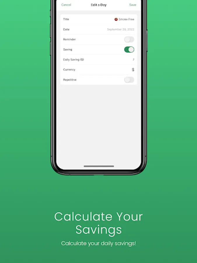 - Calculates your total savings with Daily Savings. (Like quitting smoking)