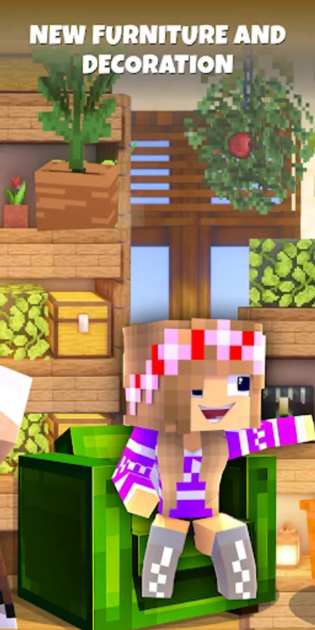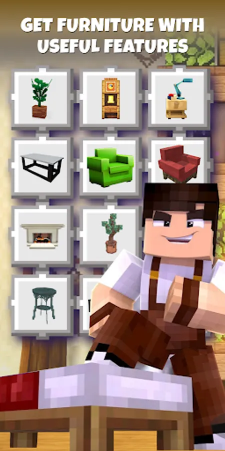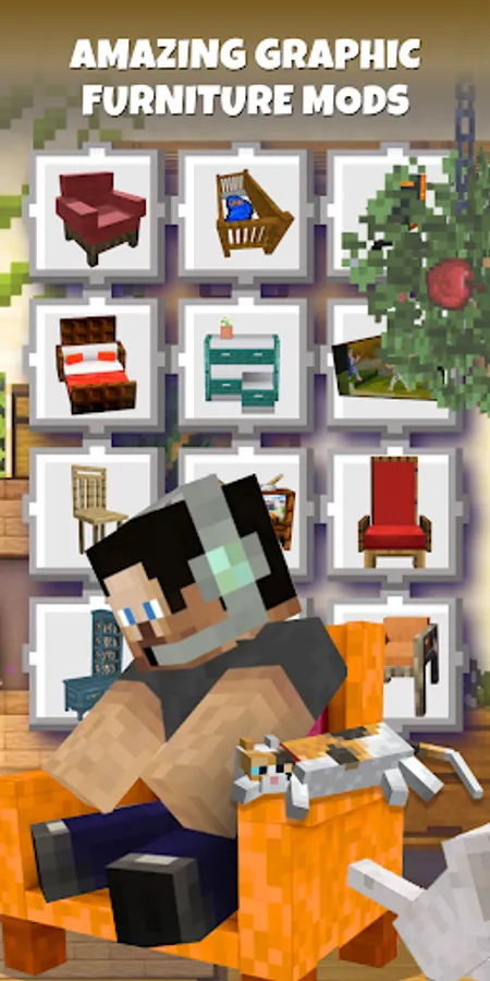 Furniture Mods for Minecraft is an application that contains an extensive collection of mods, maps, skins, and a list of popular servers, as well as a 3D editor for skins and furniture. Here are some of the best furniture, accessories, and decorations mods. Innovative functionality allows you to create designer interior items in just a few clicks. A convenient skinmaker will diversify the gameplay's visual component and attract the multiplayer community's attention.