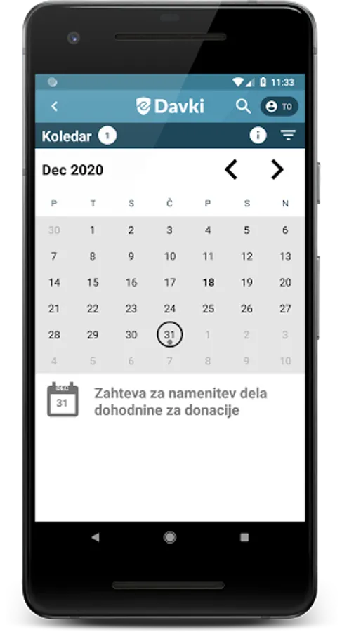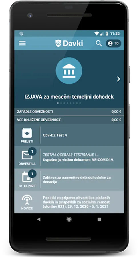 The application is intended for natural persons. It offers many features to assist you in dealings with the Financial Administration of the Republic of Slovenia. In addition to forms, contacts and general information, it offers, among other things, a personalised calendar through which you will be notified of your obligations and rights (e.g. notification of the expiry of the time limit for payment of a particular tax). If your employer fails to calculate and pay your social security contributions, you will be notified through the application as and when this happens. Taxable persons who claim a tax allowance for dependents may do so by using a pre-filled form with data from their previous year's applications.