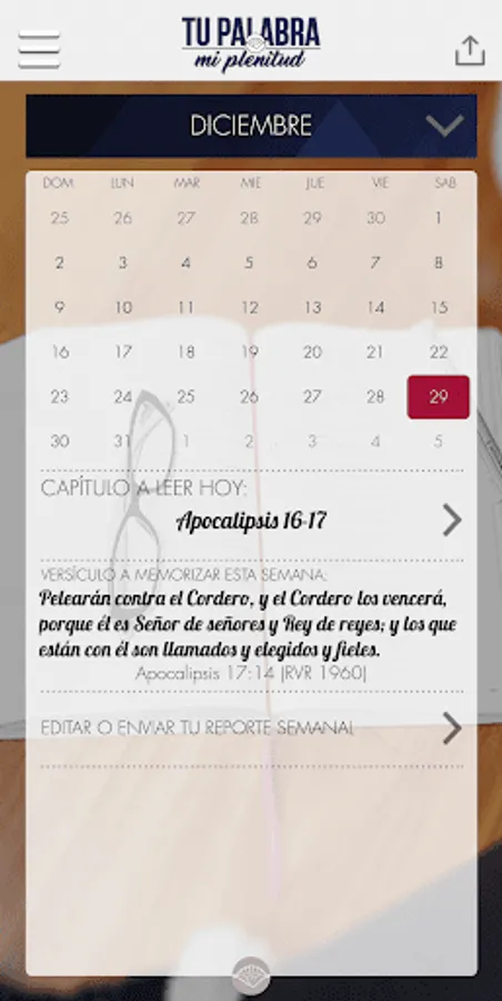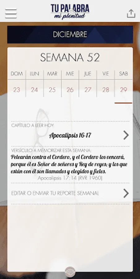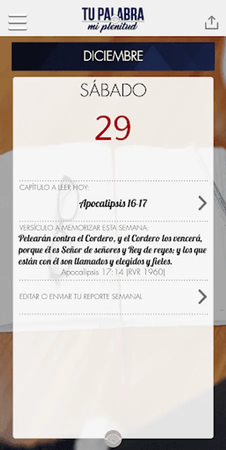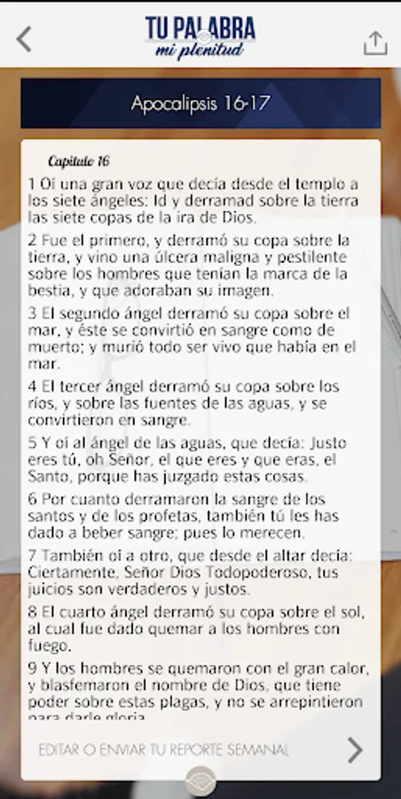 Application Bible reading plan "Thy Word my Fullness" which will send your weekly report Reading and share your progress on your social networks.
