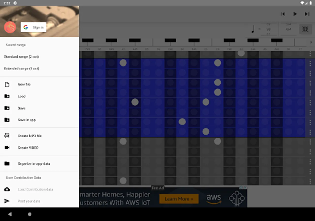Tap the three lines on the upper left to display the menu and select "Load". Please select the built-in data of this application and select a song.