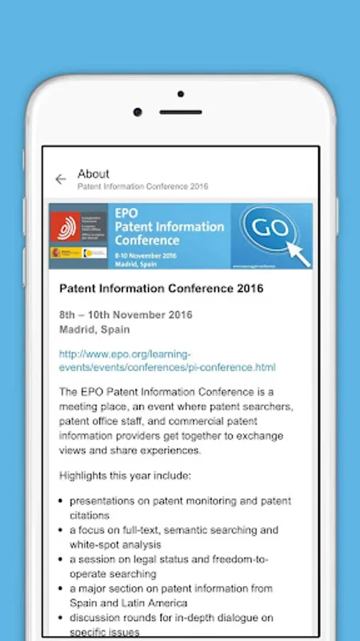 The official app of the EPO Patent Information Conference, 8 – 10 Nov 2016, Madrid Spain.