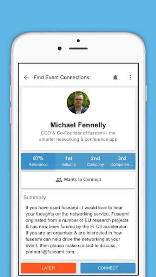 Smarter Delegate Networking: Use the networking features to discover the most relevant delegates to connect with. Benefit from personalised recommendations, or use the intelligent search to discover new connections. Once connected, you can easily message from within the app, to arrange to meet up in person.