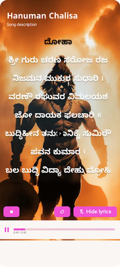 Our app offers a comprehensive platform to experience the profound spirituality and serenity of Hanuman Chalisa in the Kannada language.