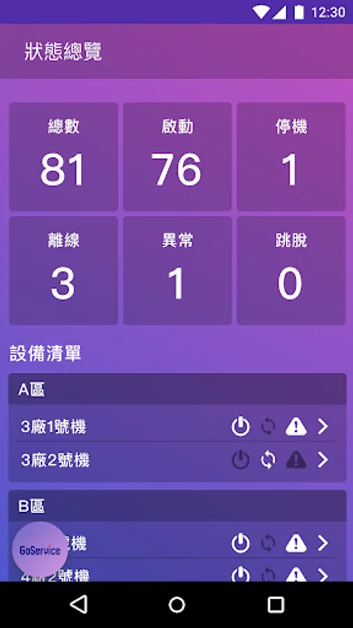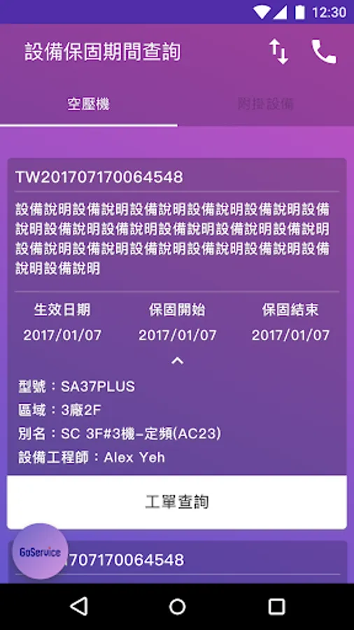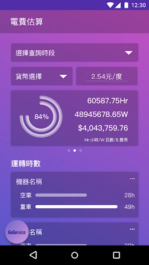 GoService is an IoT service for customers provided by FuSheng Industry Group. By GoService customers can get instant information of Compressors Status, Historical Data, Predicted Electricity Cost, Event Status, Compressors information, and also work orders, Real-time information, notifications and the service profile.. Through each kind of information mentioned above, we expect to assist customers to control and adjust their compressors and also save energy.