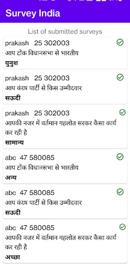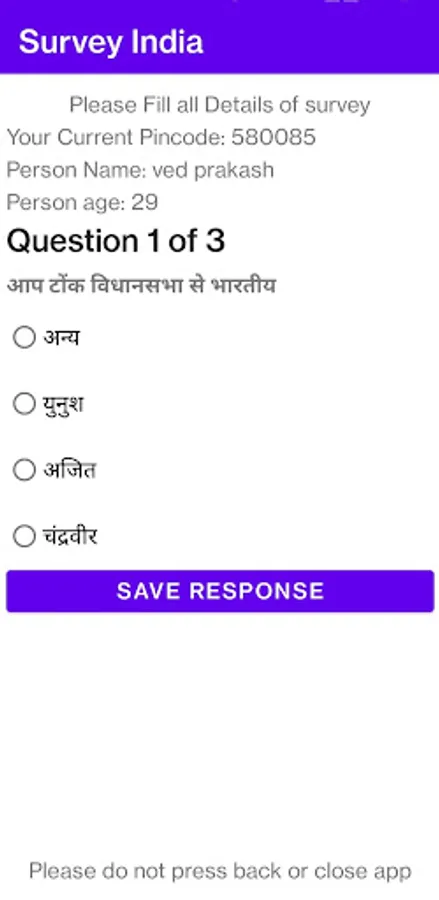this app is made by M/s Pro Printech IT Solutions to collect survey response based on fixed questions provided by their clients. The responses of questions will be saved at server and can be accessed by administrator only.