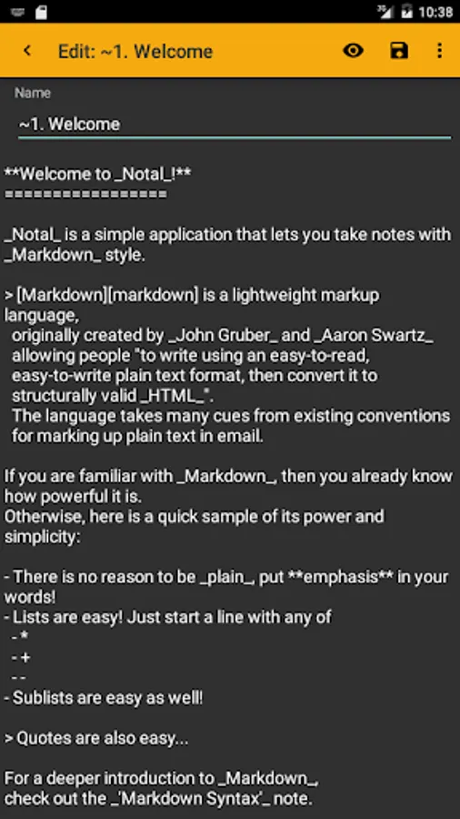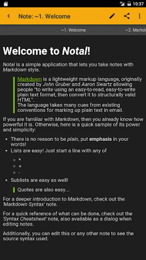 With Notal, you can type your notes with plain Markdown text and enjoy reading with a clean, simple style. If you aren't familiar with Markdown, we encourage you take a look at this new trend on writing and reading your notes.