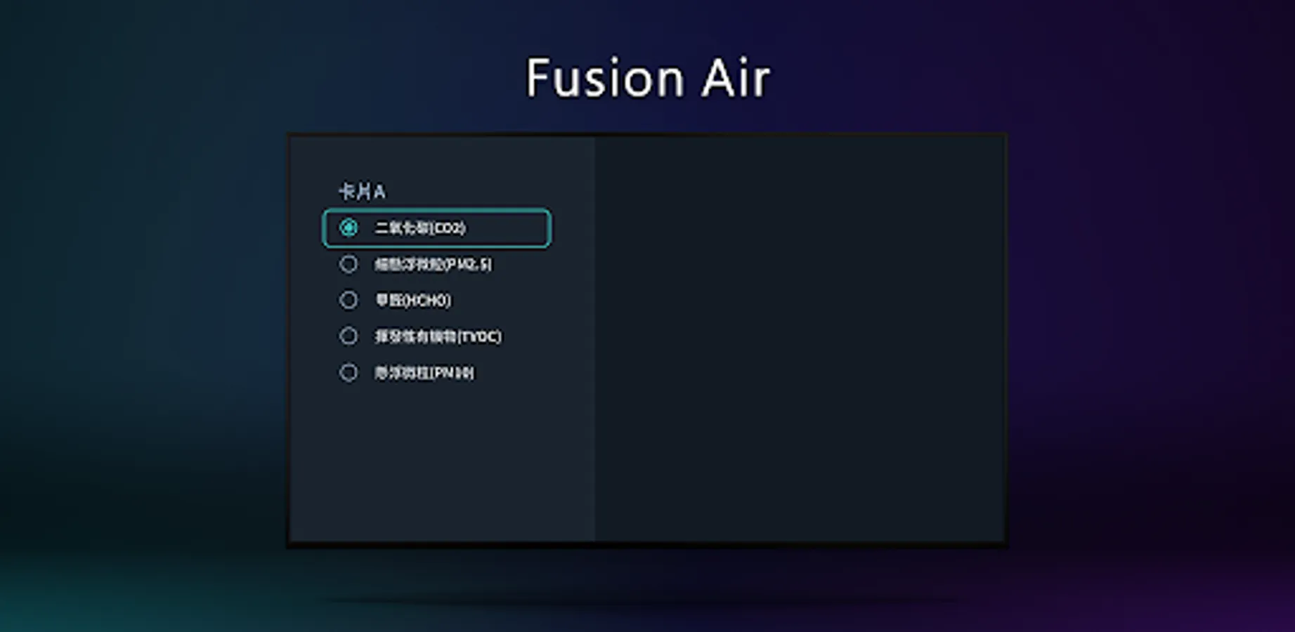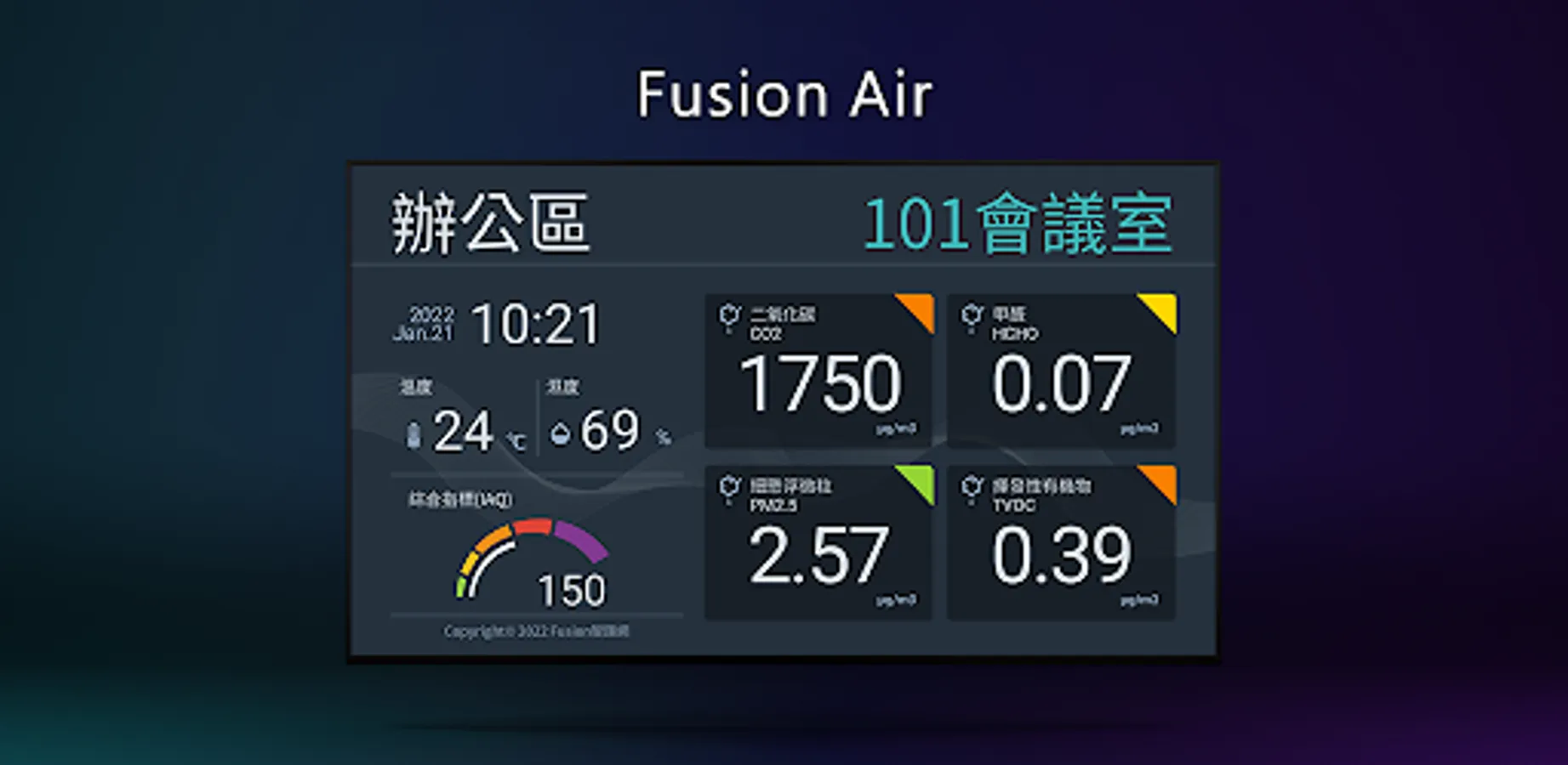 A total of 5 kinds of index data can be selected and displayed, including carbon dioxide, fine suspended particles, suspended particles, formaldehyde, TVOC, etc. You can choose 2 or 4 indicator data presentations according to your needs. *If you want to display 4 kinds of indicator data, it is recommended that you use a monitor of 42 inches (inclusive).