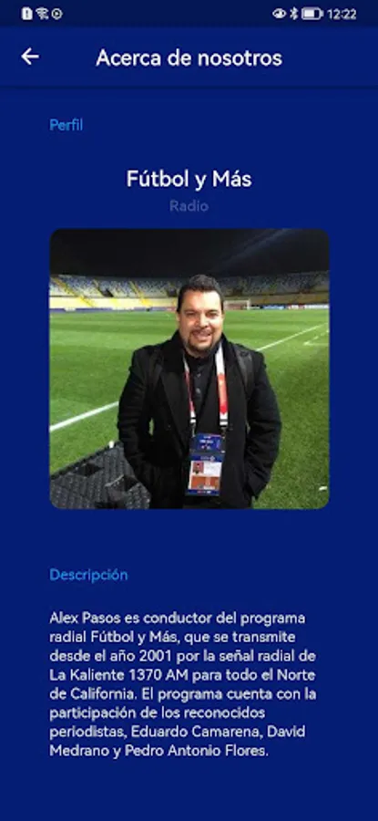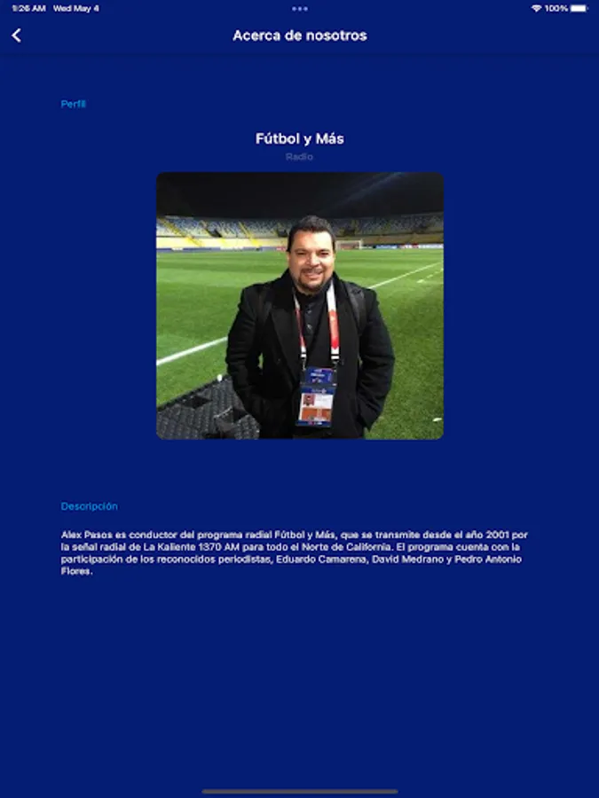 Alex Pasos is the host of the radio program Fútbol y Más, which has been broadcast since 2001 on the La Kaliente 1370 AM radio signal throughout Northern California. The program has the participation of renowned journalists, Eduardo Camarena, David Medrano and Pedro Antonio Flores.