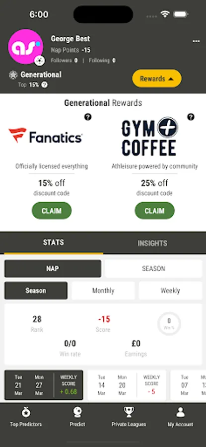 Track your prediction rank & win % stats at the competition level - can you be the number 1 ranked player for the Premier League? Discover your strengths & weaknesses.