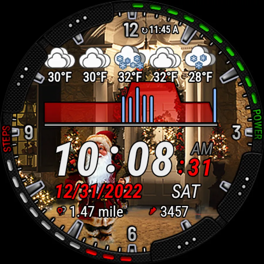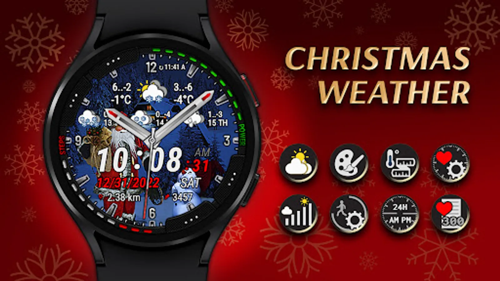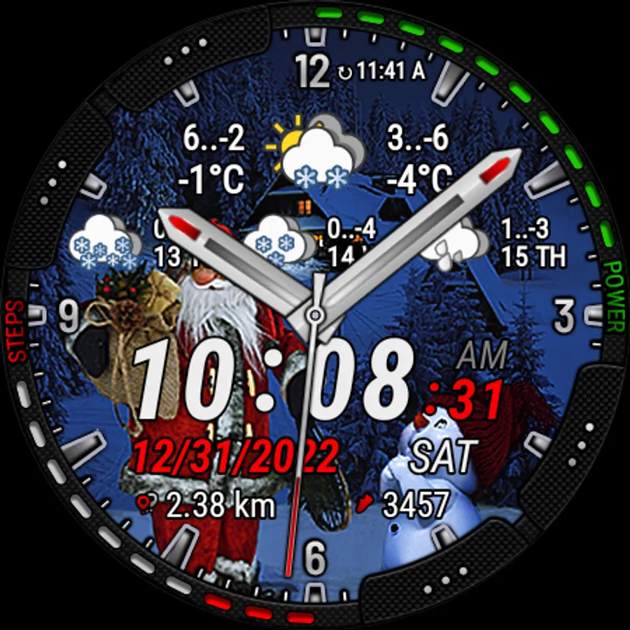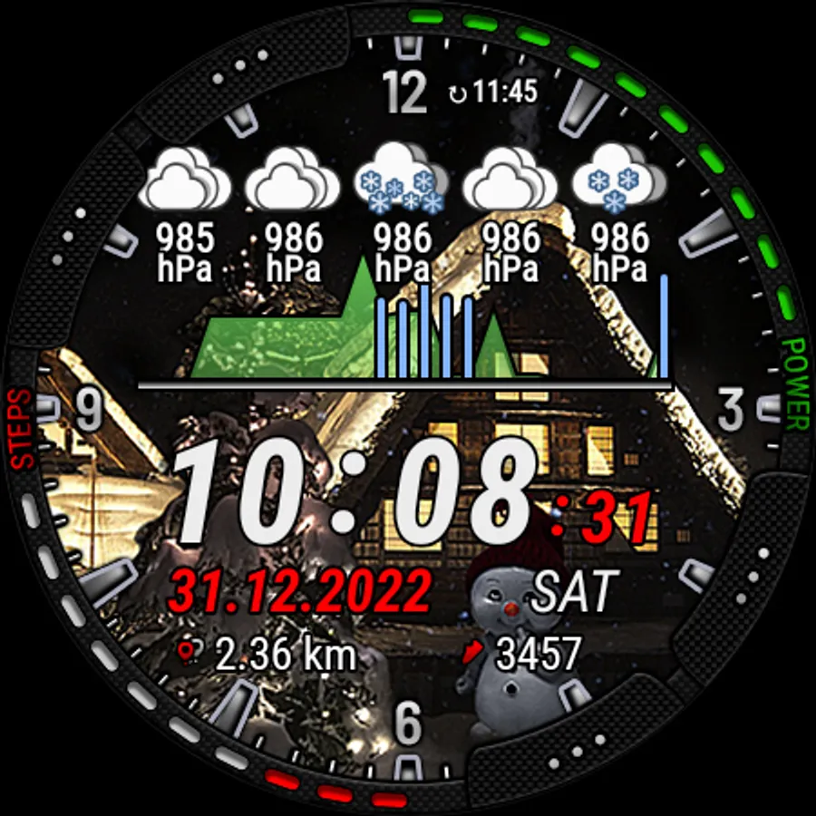 Watch face with current weather and forecast for 3 days, 25-hour weather charts and 6 New Year and Christmas backgrounds.