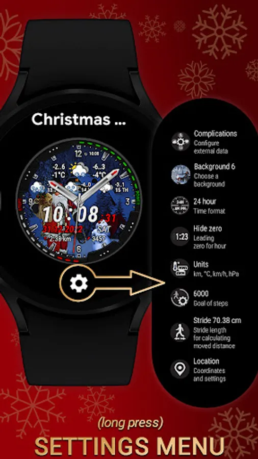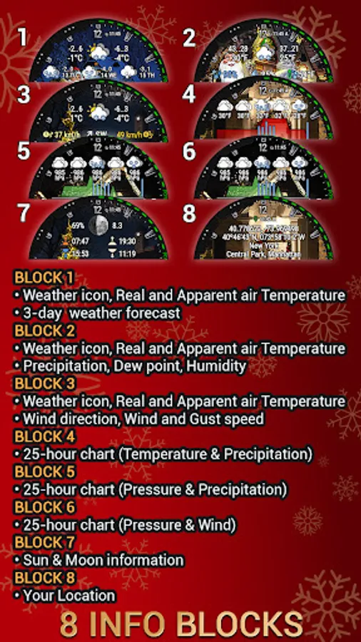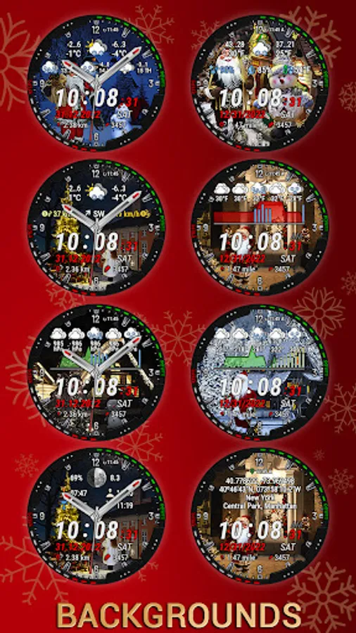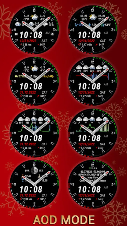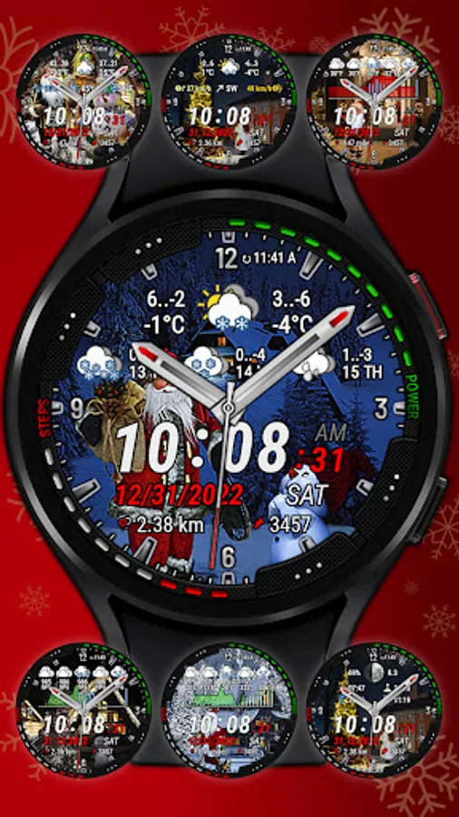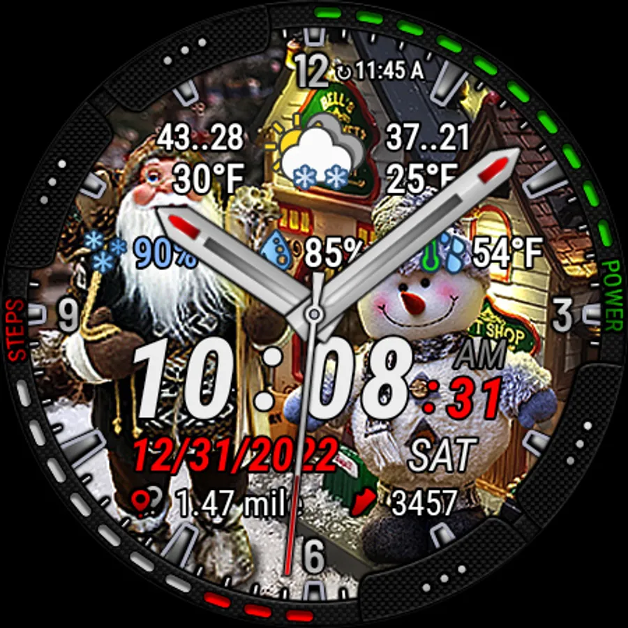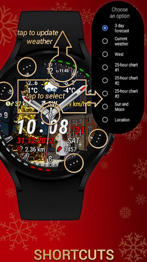 Watch face with current weather and forecast for 3 days, 25-hour weather charts and 6 New Year and Christmas backgrounds.