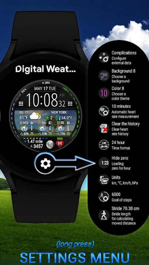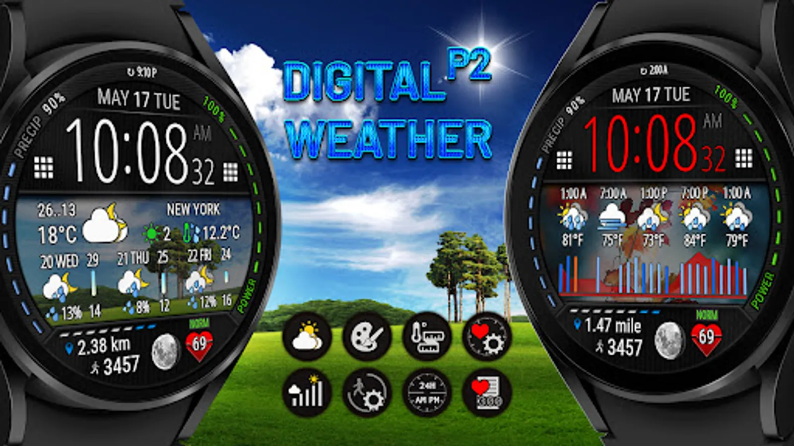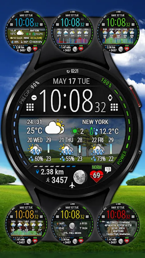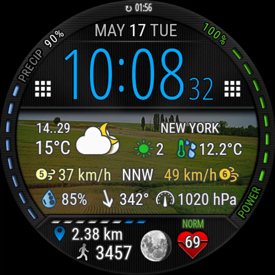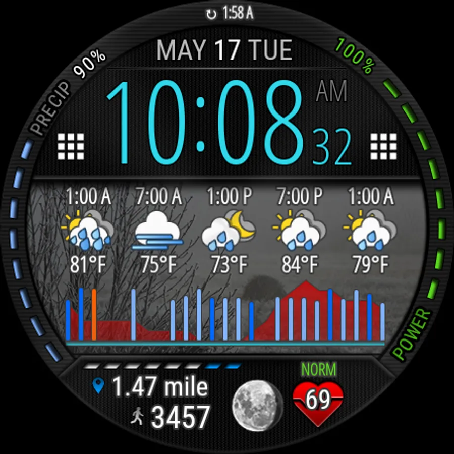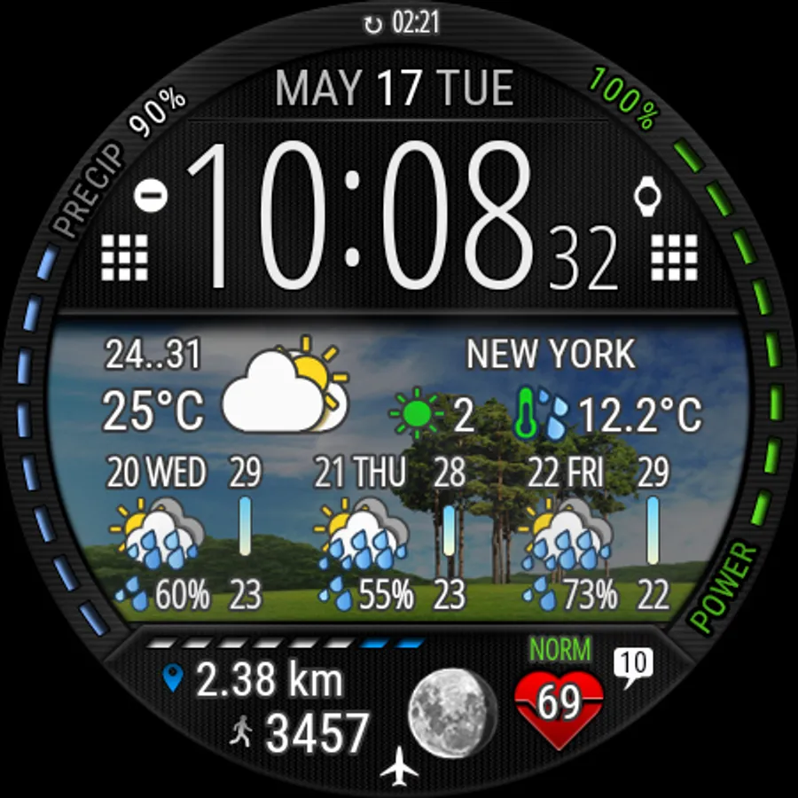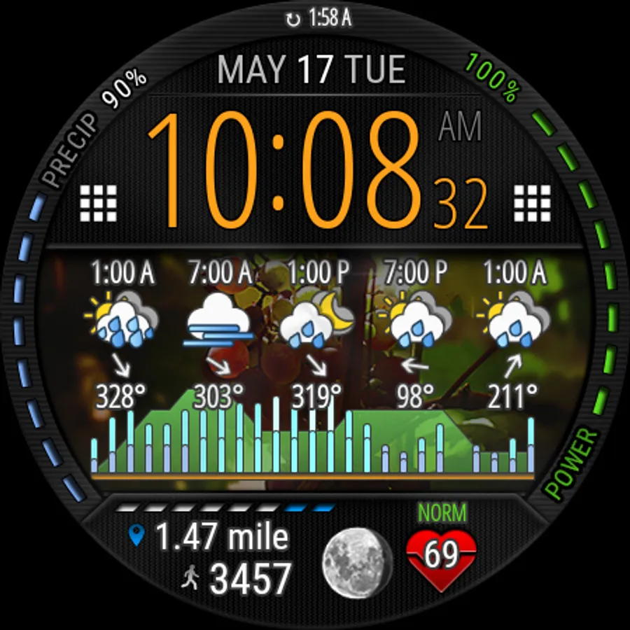 Watch face with weather forecast for 3 days, 25-hour forecast charts, 8 time symbol colors and 8 backgrounds.